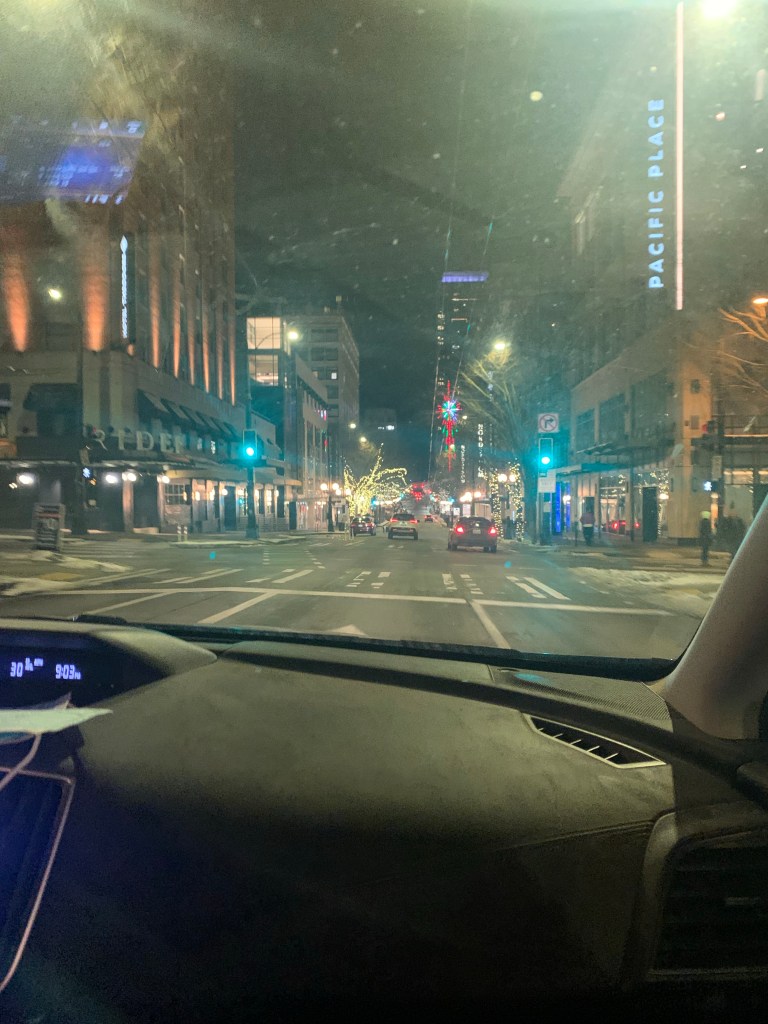 The drive is took about three hours, even with me driving. I5 is beautiful, but this time of year, most of the time, it’s really just dark. Nick got a little work done and a lot of napping 🙂 Driving down this hill toward the city… you get a true idea of just how big it is. It’s A. bigger than I thought and B. really pretty at night.
